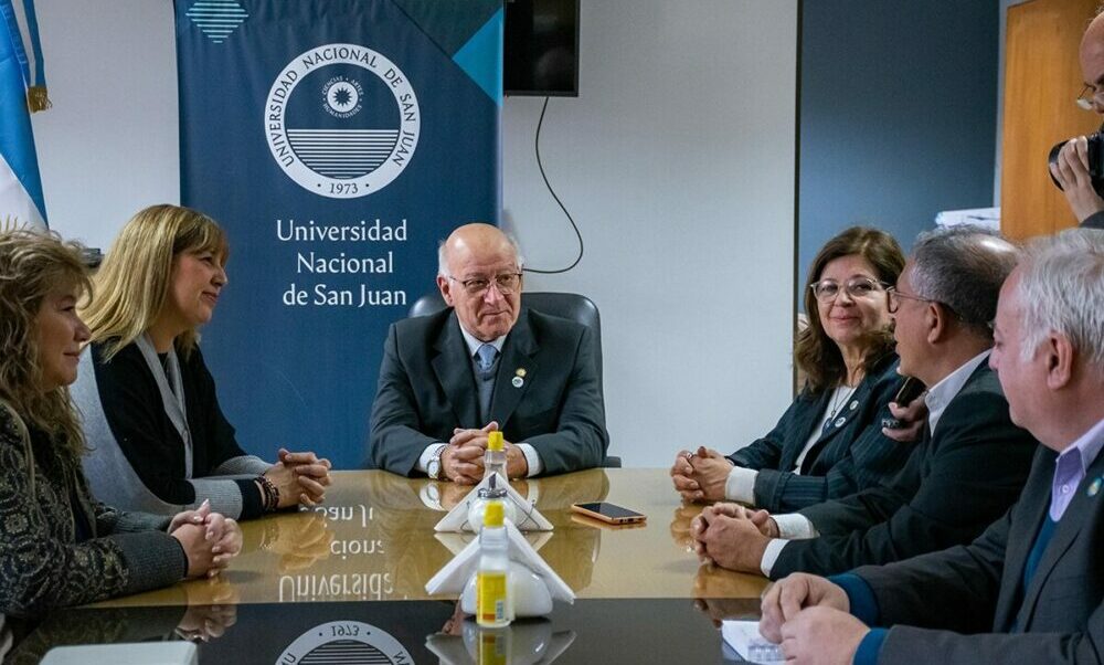 El despacho del rector de la UNSJ, Tadeo Berenguer, fue el lugar designado para la reunión que mantuvieron autoridades universitarias con autoridades del Ministerio de Salud Pública, encabezadas por la ministra Alejandra Venerando, con el fin de intercambiar opiniones e información sobre la futura implementación de la carrera de Medicina en la universidad pública.
