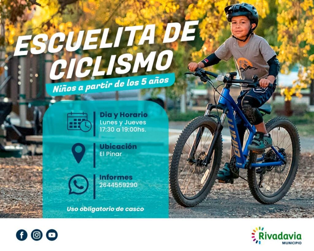 La aclamada escuelita de ciclismo para niños/as a partir de los 5 años retoma su actividad en El Pinar, Rivadavia. El deporte sobre dos ruedas se llevará a cabo los martes y jueves en dos horarios para elegir: 17.30 ó 19.